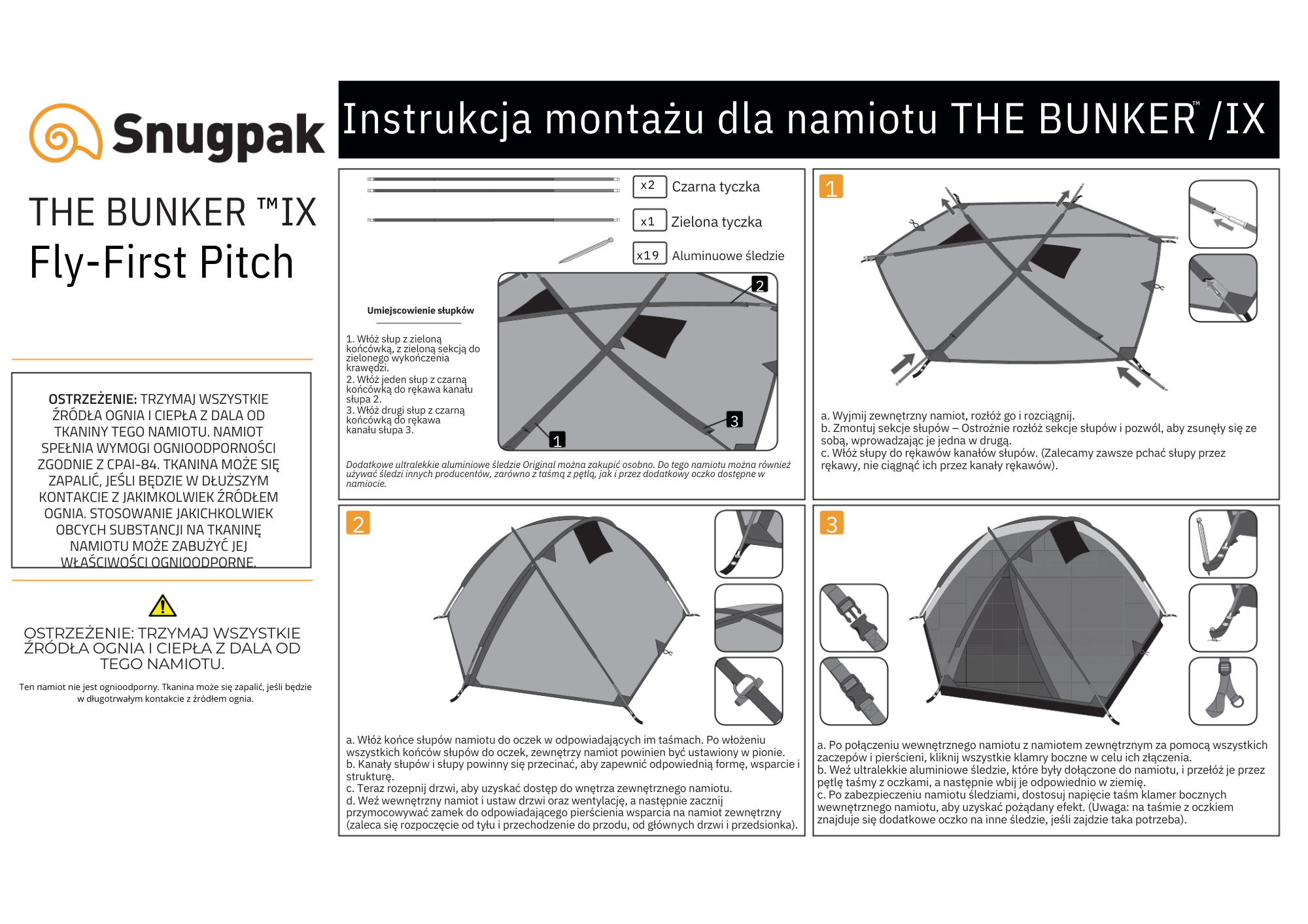 Namiot Bunker w komplecie posiada 19 lekkich aluminiowych szpilek (17 + 2 zapasowe), oraz podstawowy zestaw naprawczy (bez kleju).